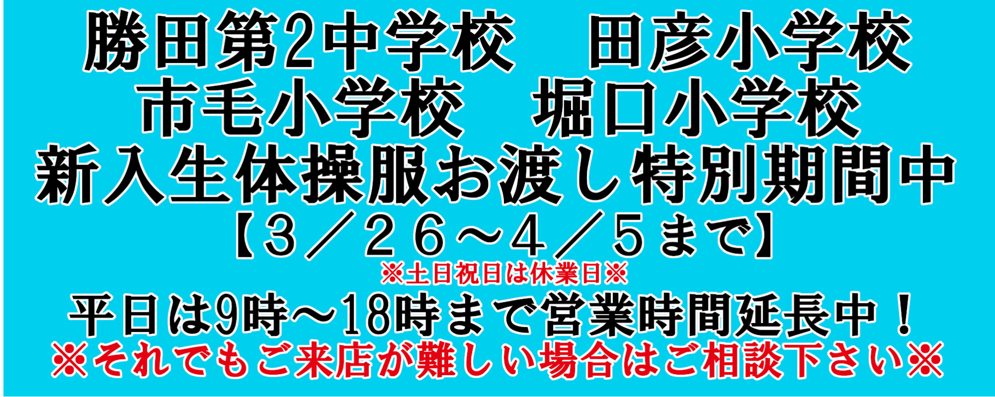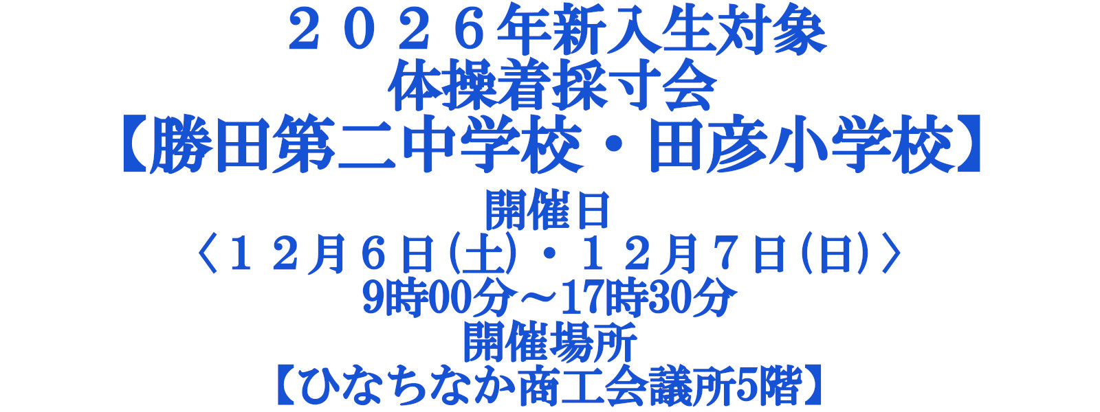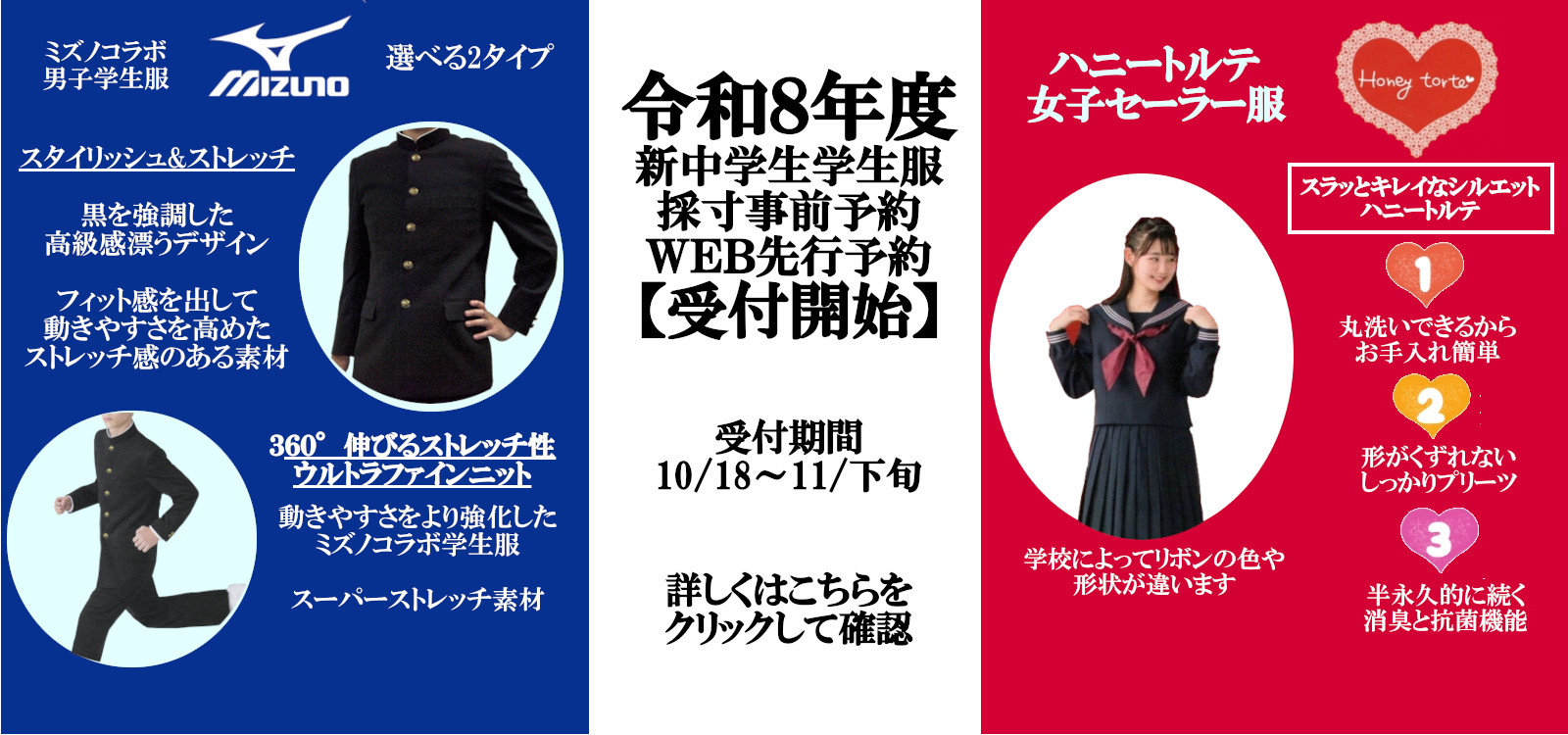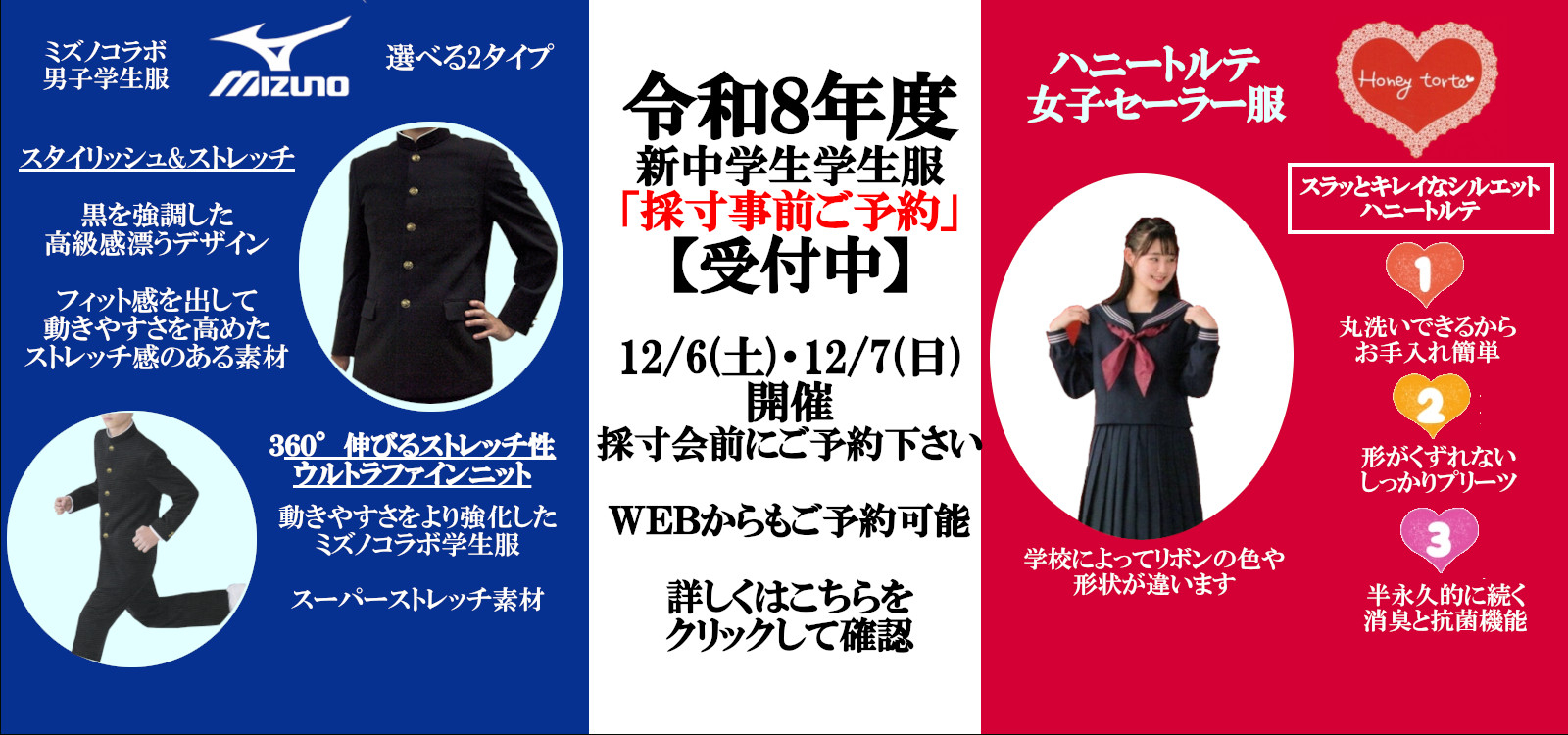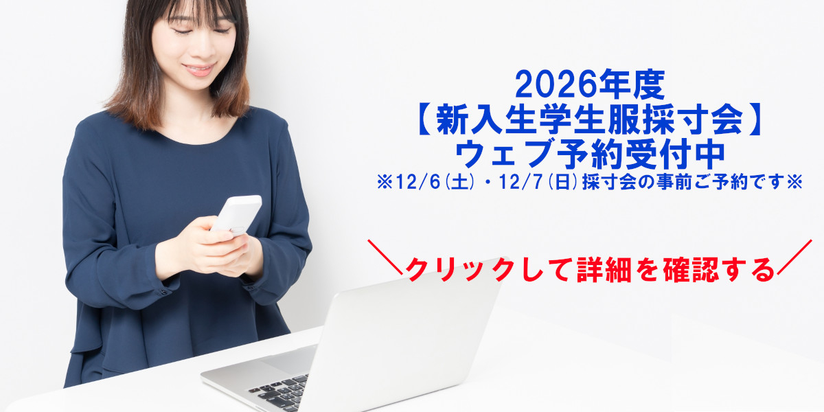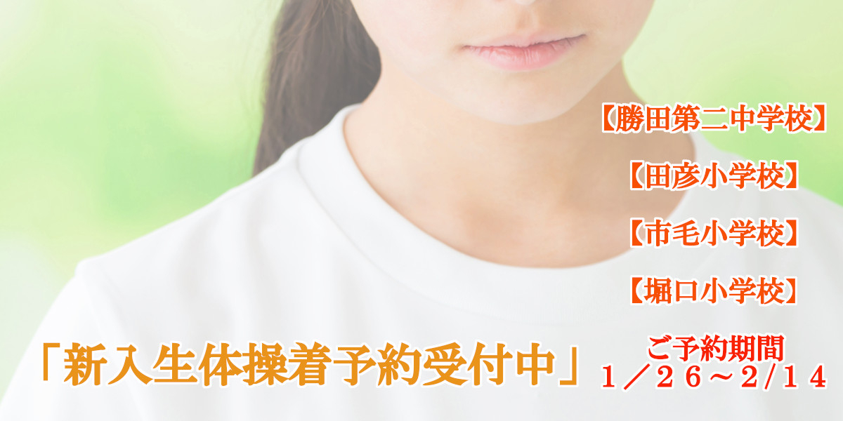 pickup 2025年度 新入生学生服情報【終了しました】今年の学生服のご予約は終了しました。 取扱い学生服ご紹介コーナーより機能性が向上したミズノ男子学生服やラインが細く見える女子ハニートルテセーラー服その他学生服の詳細もご確認いただけます。 取扱い体操服のご案内勝田第二中学校、堀口小学校、市毛小学校、枝川小学校、田彦小学校の体操服についてご確認いただけます。 学生服の資料請求はこちらから